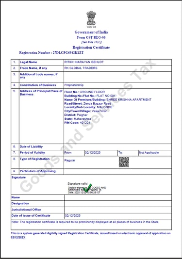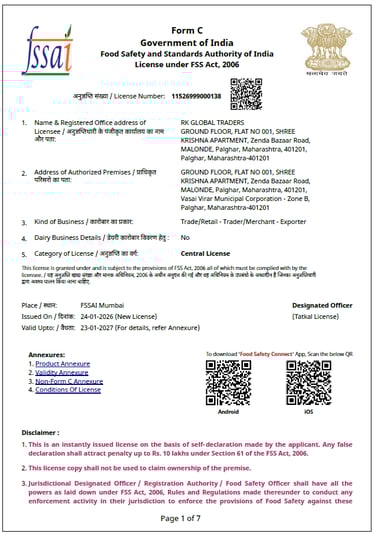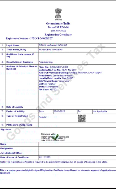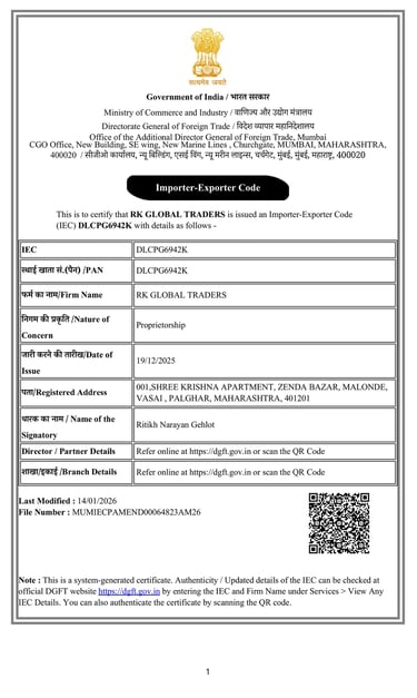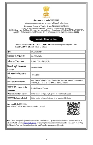 RK GLOBAL TRADERS is a dedicated trading company founded with the vision of connecting global buyers with reliable, high-quality products sourced from India. We pride ourselves on building strong partnerships and delivering consistent value to our clients, focusing on integrity, efficiency, and customer satisfaction.